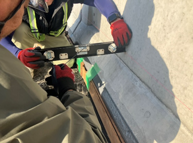 グレーチングの高さを水平器などで計っています。