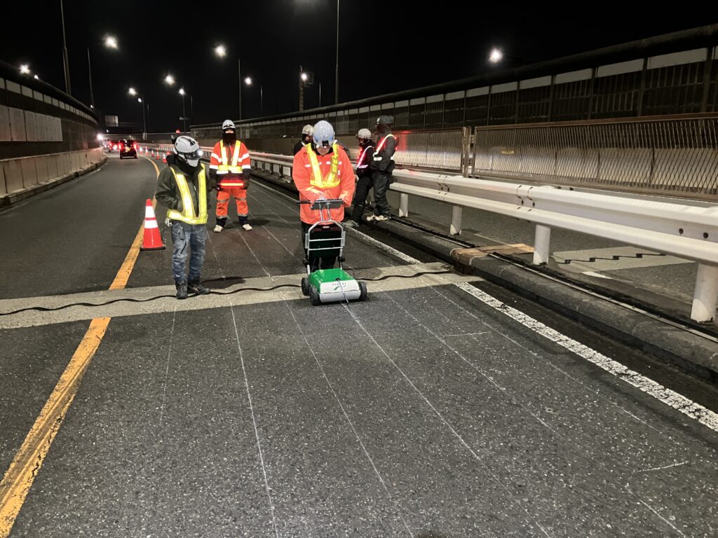 今回は2日間に分けて、追い越し車線で6本、走行車線で6本、合計約300メートルの区間で罫書きと打音測定作業を行いました。